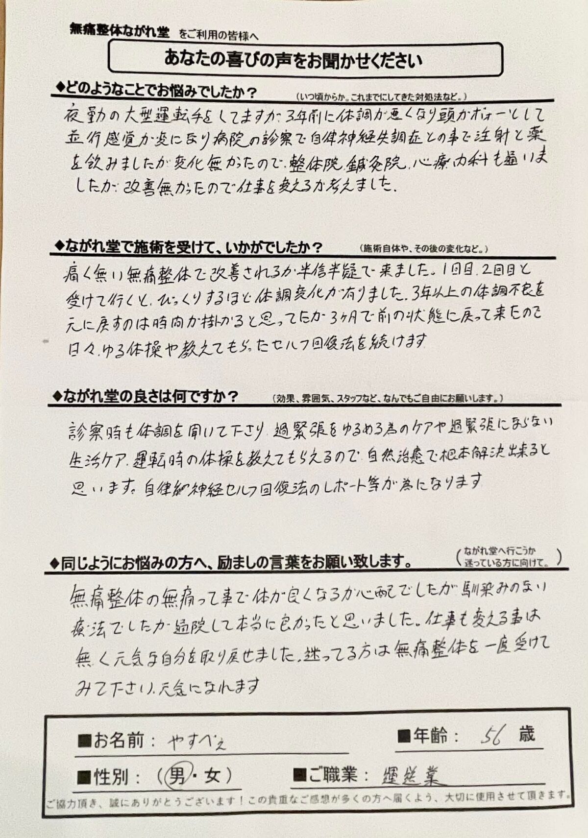 診察時も体調を聞いて下さり、過緊張をゆるめる為のケアや過緊張にならない生活ケア、運転時の体操を教えてもらえるので、自然治癒で根本解決出来ると思います。